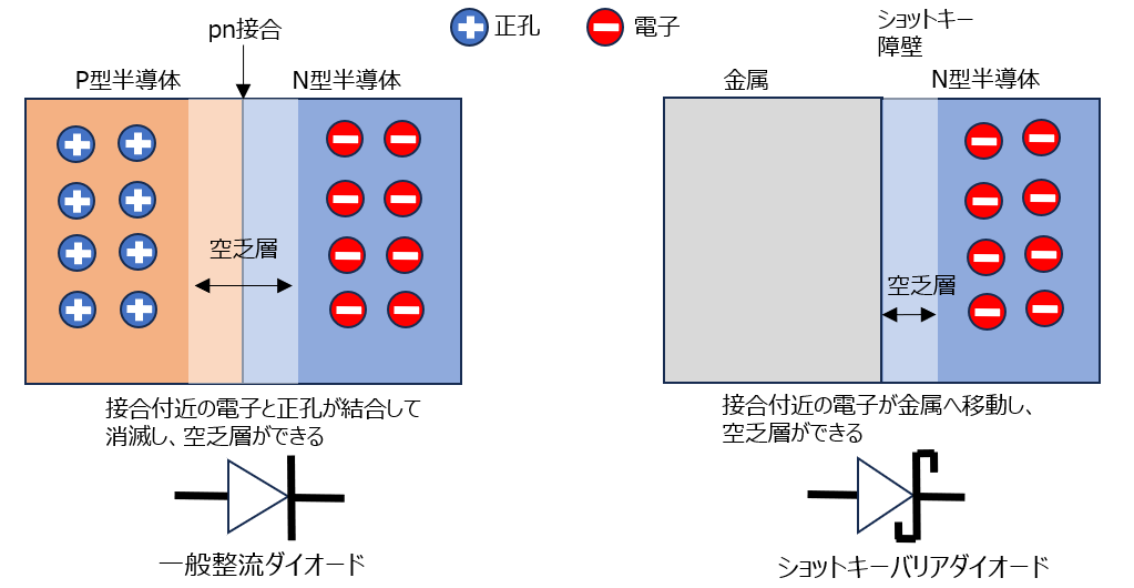 P型半導体では正孔がキャリアとして存在しており、N型半導体では電子がキャリアとして存在しています。これらを接合したpn接合付近では、電子と正孔が結合して消滅し、電子も正孔もない空乏層が形成されます。一方ショットキー接合の場合は、N型半導体内の電子が金属側に移動し、接合付近はやはり電子がない空乏層が形成されます。次に、これらに順方向に電圧をかけた(=電界を生じさせた)場合を考えます。