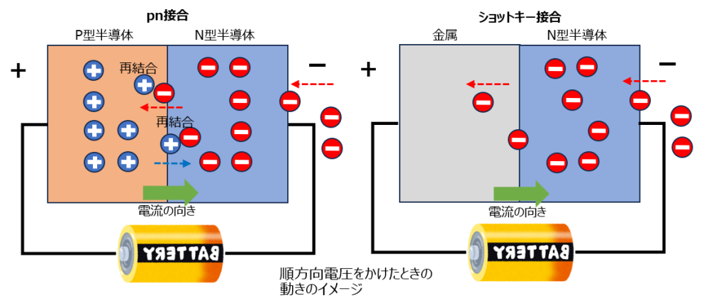 pn接合では、順方向電圧のためN型、P型ともキャリアが接合部分に押しやられ空乏層が消失します。接合部分では正孔と電子が再結合し、N型半導体には電池から電子が入ってくる流れができ、電流が流れることになります。一方ショットキー接合でも電子が接合部分に押しやられ空乏層が消失し、電子の流れができます。なお、電流の向きとしては、電子の流れの逆ということになります。