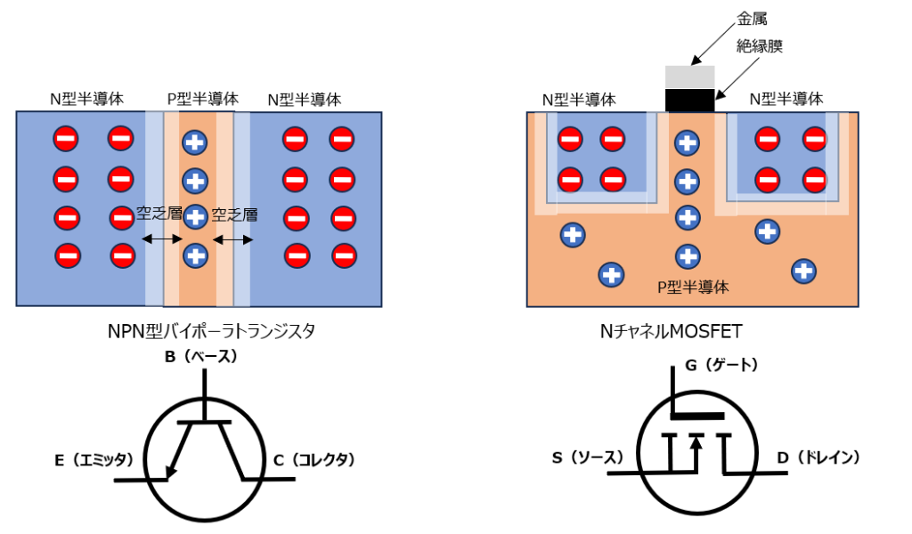 次にトランジスタについて考えてみます。バイポーラトランジスタとMOSFETの回路記号と動きについては、それぞれ以前記事を作成いたしましたので、よろしければご覧いただければと思います。それぞれ図のような構造になっていて、ダイオードと同じようにpn接合部分には空乏層が形成されています。これらについて、トランジスタをON状態にした場合を考えてみます。