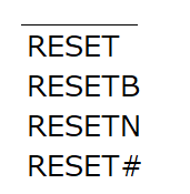 これが信号名の本体ともいえるでしょう。過電流(OVer Current)の意味でOVCB とつけてみました。一番最後のBは負論理を表しています。「論理」と言っている時点で、これはデジタル信号であることを意味しています。出力しているのもオペアンプで電圧を出しているのではなく、コンパレータの出力であることが想起できます。デジタル信号として1やHighのときがその事象なら正論理、0やLowでその事象なら負論理となります。ここでは、Lowになったら過電流が発生したことを表す、ということになります。負論理の場合はB以外にも、信号名の上に線を引いたり、#、N、Bなどを信号名の前や後ろに付けたりします。よくあるのはリセットの信号で、負論理のリセットは以下のように表されたりします。 Bは上に引く線(Bar)のことを意味しているのではないかと思います