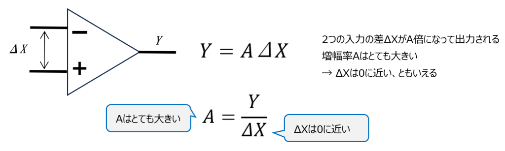 オペアンプの役割は、2つの入力の電圧差を増幅することです。その電圧差をΔX、出力電圧をYとすると、Y=A・ΔXというように、入力の電圧差をA倍して出力すると表すことができます。増幅率Aはとても大きい(数万倍とか数十万倍)という特徴があります。これを数式上でみると、ΔXは0に近いとも言えます。
